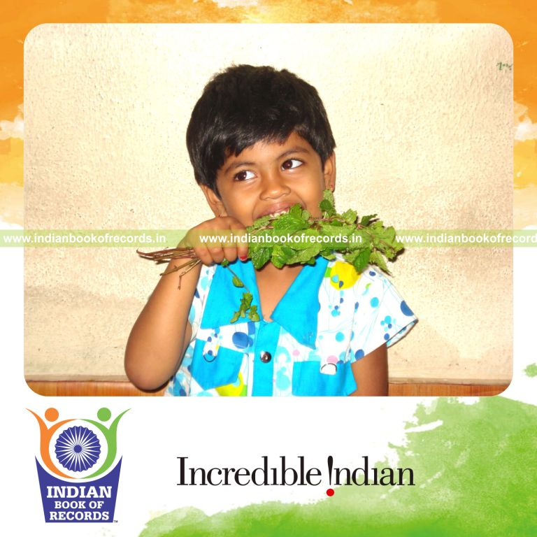 Eating Fresh Green Leaves lasted for 25 minutes and a total of 250 grams of green leaves were eaten. It was accomplished by Chintapatla Kushi in St Ann's High School, Secunderabad, Andhra Pradesh, India on November 26, 2006.