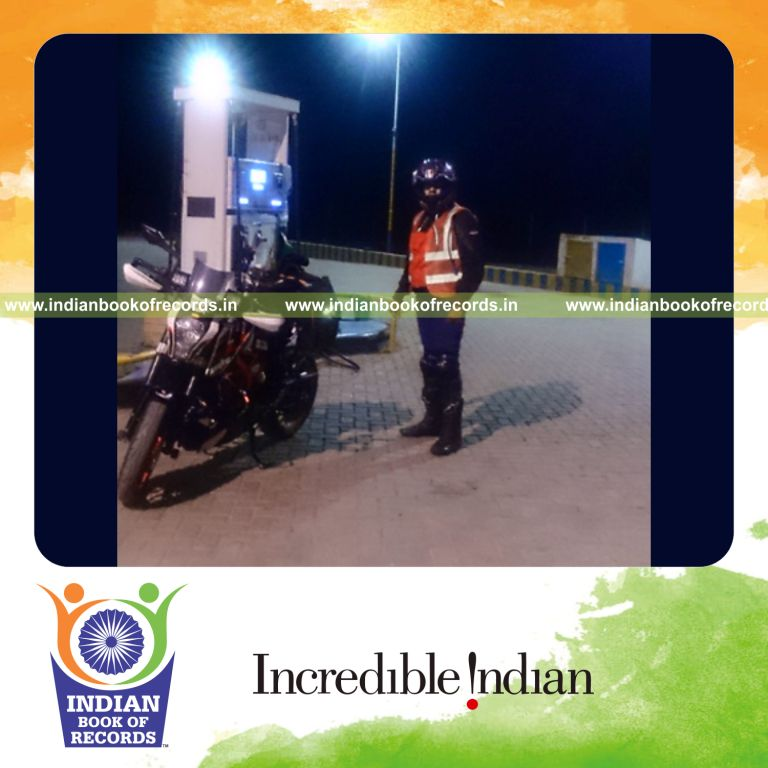 The Fastest Motorcycling by an Individual (Male) covered 2,308 kilometers in 23 hours and 58 minutes. It was accomplished by Karthik Manivannan Naidu, starting from Shell Fuel, Tumkur Road, Bengaluru and ending at Shell Bellary Road, Bengaluru, Karnataka, India on March 24, 2016.