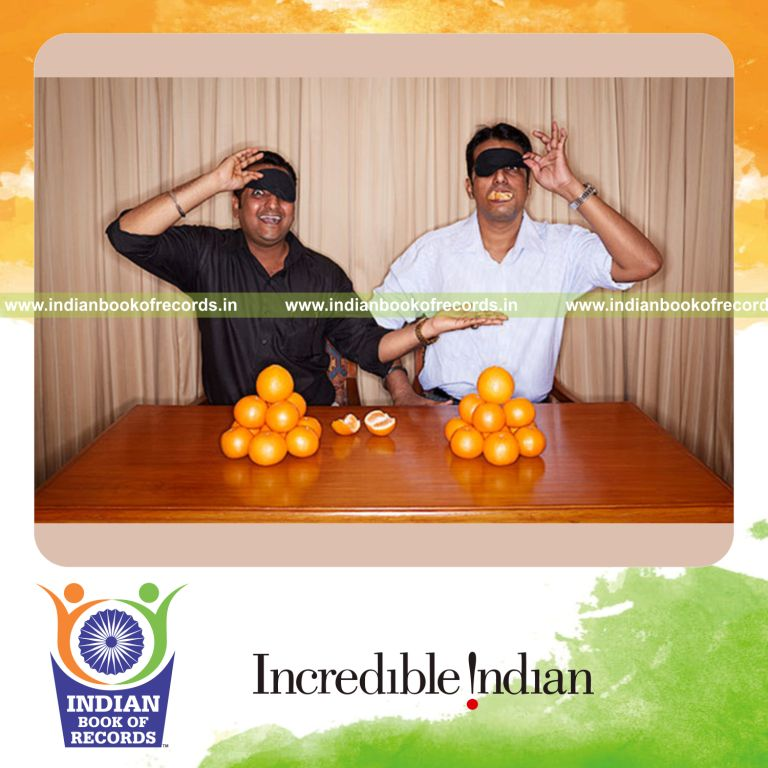 The Fastest Time to Peel and Eat an Orange Blindfolded (Team of Two) clocked to 17.15 seconds. It was accomplished by Manish Upadhyay and Dinesh Upadhyaya at Goregaon, Mumbai, India on March 5, 2014.