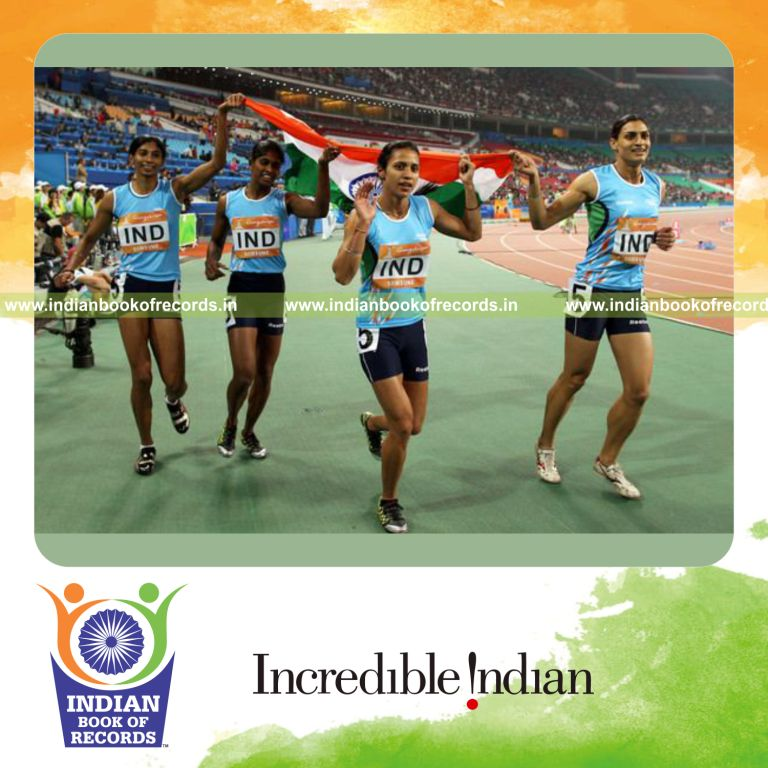 The Fastest Time to perform 4 × 400 metres Relay (Female) clocked to 3 Minutes 26.89 Seconds. It was accomplished by Chitra K. Soman, Rajwinder Kaur, K. M. Beenamol, and Manjit Kaur at Athens, Greece on August 27, 2004.