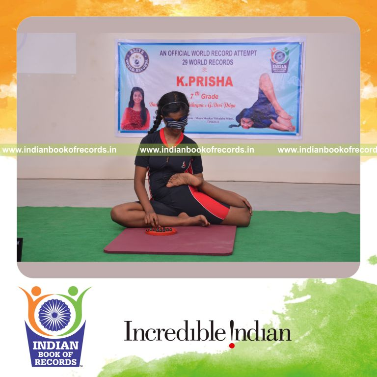 The Fastest Time to Solve Brainvita while Holding Vamadevasana Yoga Pose Blindfolded by an Individual (Female) clocked to 49 seconds. It was accomplished by Prisha Karthikeyan, at Meena Sankar Vidyalaya, Tirunelveli District, Tamil Nadu, India on July 7, 2021.