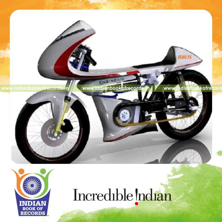 The First Compressed Air Powered Bike had a capacity to generate 5.5 hp and a air engine measured 100 mm in outer casing diameter, 75 mm in rotor diameter and 35 mm in width. It was accomplished by Bharat Raj Singh and Prof Onkar Singh in Lucknow, Uttar Pradesh, India on May 10, 2013.