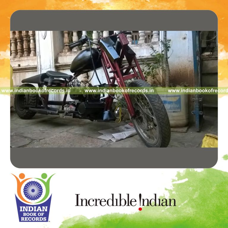 The First Identified Hybrid Motor Cycle made by an Individual (Male) measured 2.74 meters (9 feet) in length and 0.61 meter (2 feet) in height. It runs on both electric battery and petrol. It was accomplished by Ruzbeh Gav, a Student of Automobile Engineering, Surat, Gujarat, India on January 10, 2016.