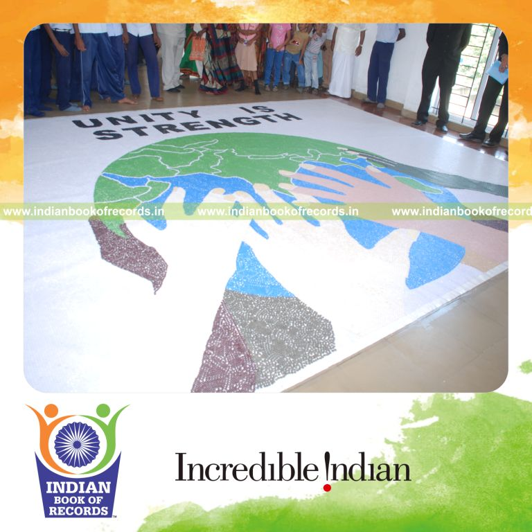 The Largest Button Mosaic by an Individual (Male) measured 25 square meters (269.10 square feet). It was accomplished by J.P.Suriya, Studying in Class X of The Frontline Academy Matriculation Higher Secondary School, Tirupur District, Tamil Nadu, India from January 23, 2013 to January 25, 2013.