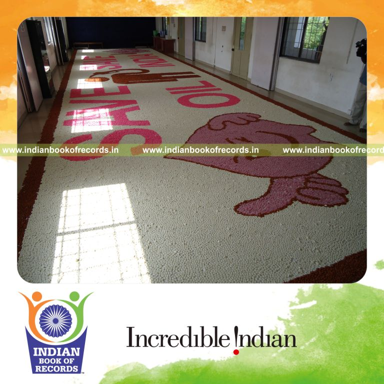 The Largest Candy Mosaic by a Minor (Female) measured 90 square meters (968.75 square feet). It was accomplished by S.Mohamed Nasrin, Achariya Bala Siksha Mandir, Puducherry, India on July 10, 2011.