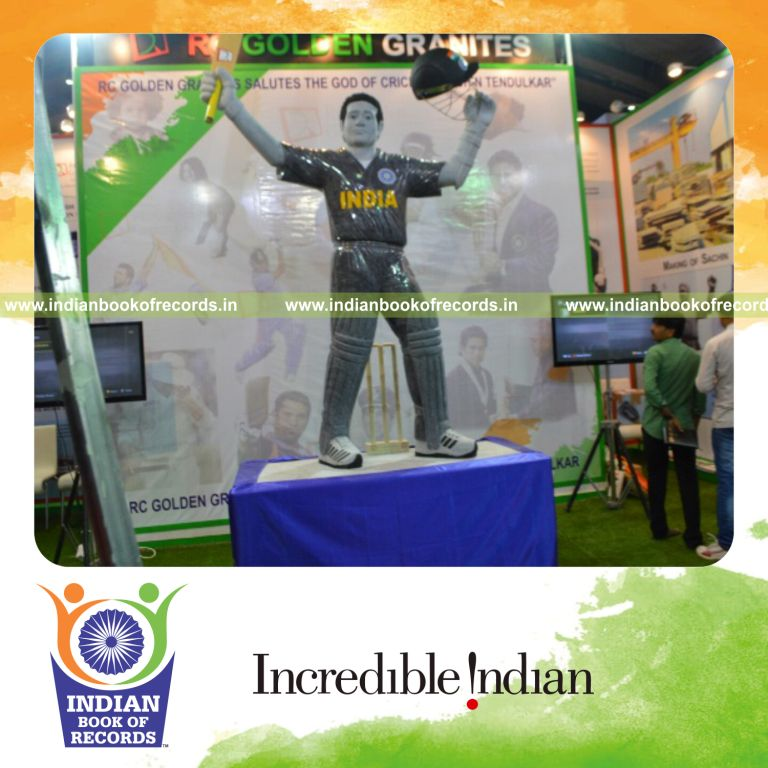 The Largest Granite Statue of Sachin Tendulkar measured 6.13 square meters (66 square feet) in height and weighed 4,000 kilograms. It was accomplished by RC Golden Granites Private Limited at All India STONA 2014 Fair, Bangalore, Karnataka, India from February 12, 2014 to February 15, 2014.