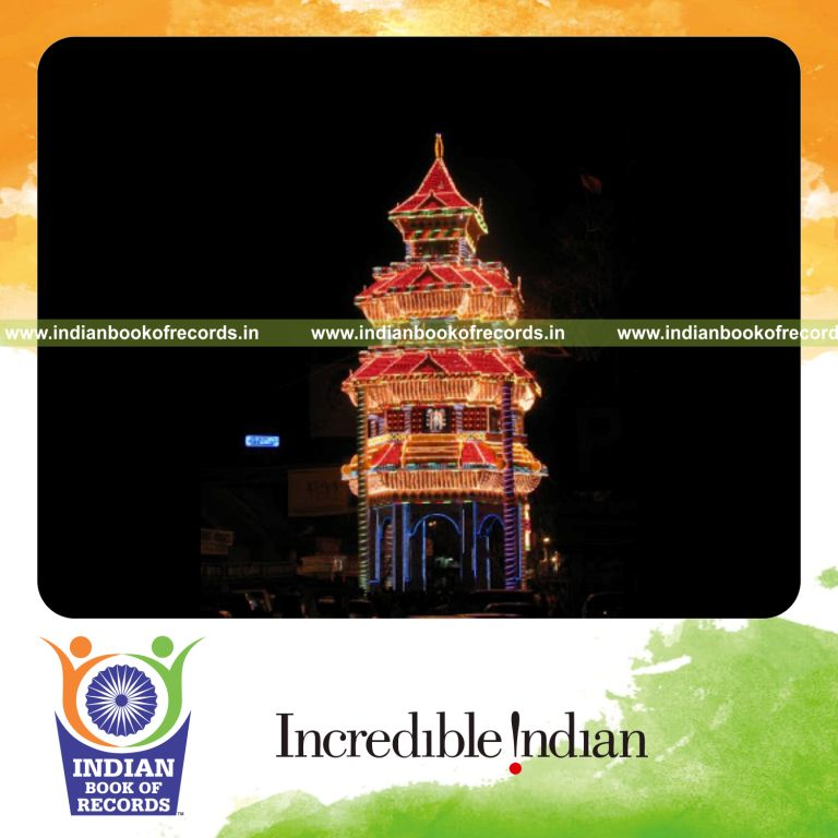 The Largest Pooram Pandal measured 18.29 meters (60.01 feet) in height. It was accomplished by Thiruvambady Devaswom at Naduvilal Junction, Swaraj Round, Thrissur, Kerala, India on May 3, 2009.