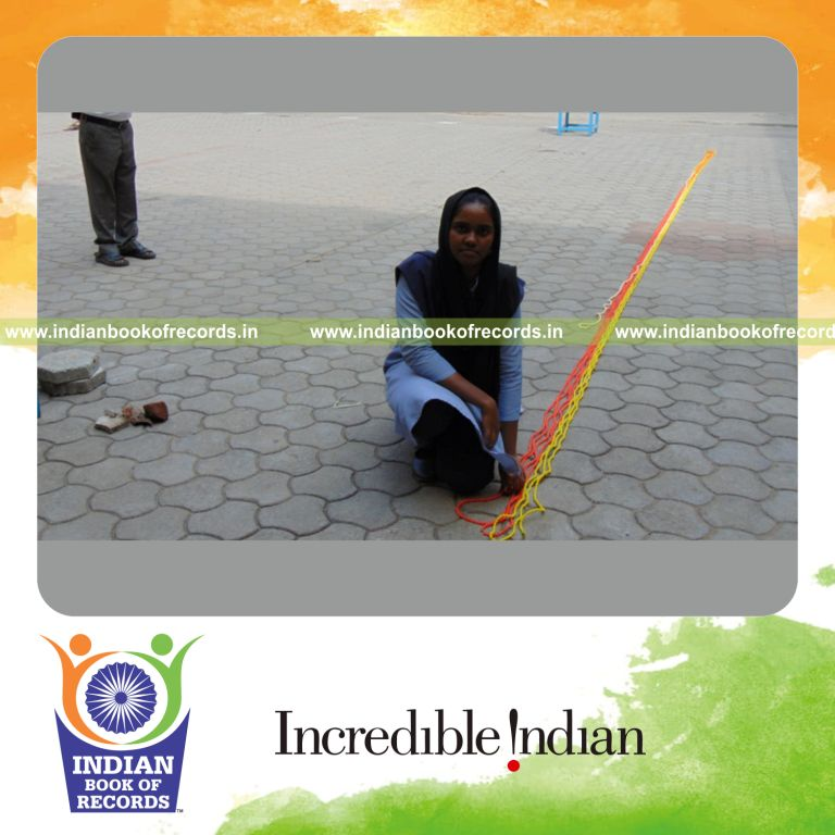 The Longest Bead String made by a Minor (Female) in 4 Hours measured 76.92 meters (252.36 feet) in length. It was accomplished by S.Thalfiya Nasreen, Studying in Class XI of CMS Matriculation Higher Secondary School, Ganapathy, Coimbatore District, Tamil Nadu, India on December 4, 2015.