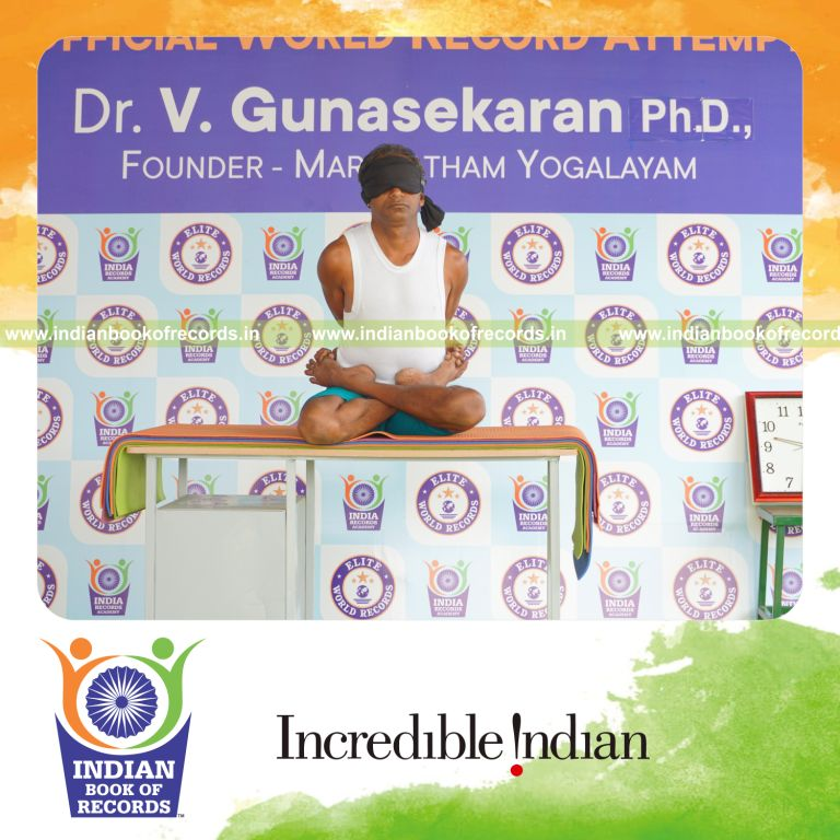 The Longest Duration Holding Baddha Padmasana Yoga Pose Blindfolded on a Table by an Individual (Male) lasted for 3 Minutes and 5 Seconds. It was accomplished by Dr.V.Gunasekaran, Founder-Maragatham Yogalayam at Udumalpet, Tirupur District, Tamil Nadu, India on September 24, 2019.