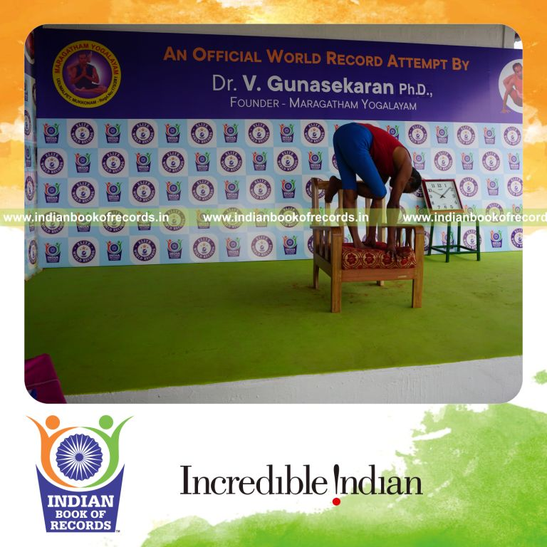 The Longest Duration Holding Daksina Ardha Baddha Padmottasana Yoga Pose on a Chair by an Individual (Male) lasted for 3 Minutes and 3 Seconds. It was accomplished by Dr.V.Gunasekaran, Founder-Maragatham Yogalayam at Udumalpet, Tirupur District, Tamil Nadu, India on September 28, 2019.