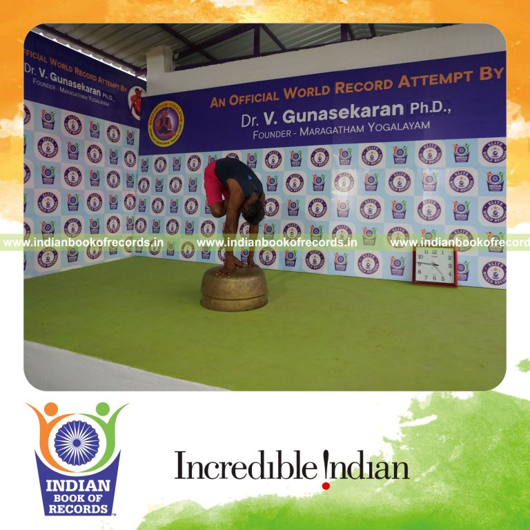 The Longest Duration Holding Daksina Ardha Baddha Padmottasana Yoga Pose on a Vessel by an Individual (Male) lasted for 3 Minutes and 2 Seconds. It was accomplished by Dr.V.Gunasekaran, Founder-Maragatham Yogalayam at Udumalpet, Tirupur District, Tamil Nadu, India on September 27, 2019.