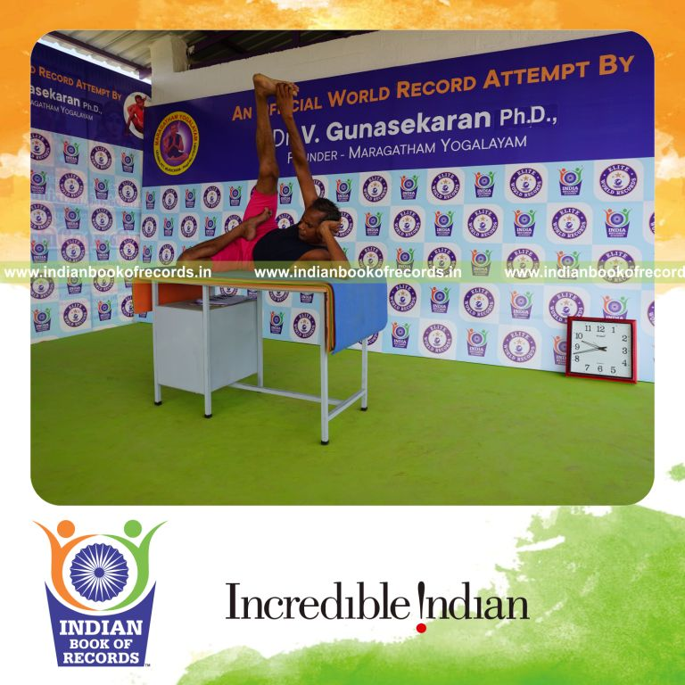 The Longest Duration Holding Daksina Ardha Padma Anantasana Yoga Pose on a Table by an Individual (Male) lasted for 3 Minutes and 2 Seconds. It was accomplished by Dr.V.Gunasekaran, Founder-Maragatham Yogalayam at Udumalpet, Tirupur District, Tamil Nadu, India on September 27, 2019.