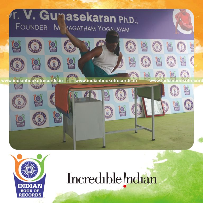 The Longest Duration Holding Daksina Ardha Parsva Krounchasana Yoga Pose Blindfolded on a Table by an Individual (Male) lasted for 3 Minutes and 5 Seconds. It was accomplished by Dr.V.Gunasekaran, Founder-Maragatham Yogalayam at Udumalpet, Tirupur District, Tamil Nadu, India on September 24, 2019.