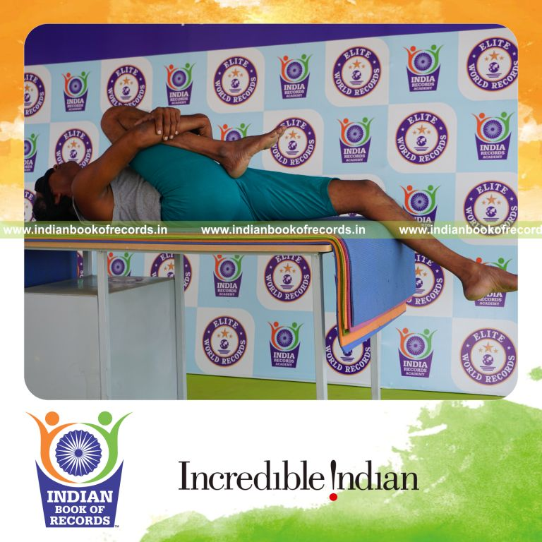 The Longest Duration Holding Daksina Ardha Pavanamuktasana Yoga Pose Blindfolded on a Table by an Individual (Male) lasted for 3 Minutes and 5 Seconds. It was accomplished by Dr.V.Gunasekaran, Founder-Maragatham Yogalayam at Udumalpet, Tirupur District, Tamil Nadu, India on September 29, 2019.