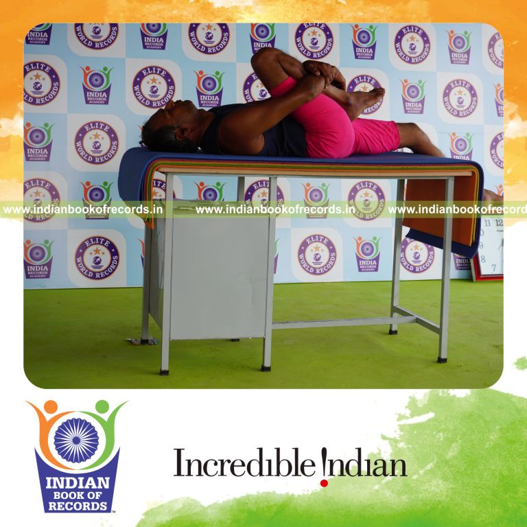 The Longest Duration Holding Daksina Ardha Pavanamuktasana Yoga Pose on a Table by an Individual (Male) lasted for 3 Minutes and 3 Seconds. It was accomplished by Dr.V.Gunasekaran, Founder-Maragatham Yogalayam at Udumalpet, Tirupur District, Tamil Nadu, India on September 27, 2019.