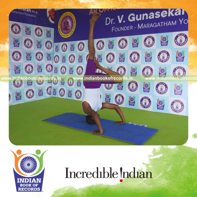 The Longest Duration Holding Daksina Ardha Salamba Sirsasana (Second Type) Yoga Pose Blindfolded by an Individual (Male) lasted for 2 Minutes and 5 Seconds. It was accomplished by Dr.V.Gunasekaran, Founder-Maragatham Yogalayam at Udumalpet, Tirupur District, Tamil Nadu, India on September 22, 2019.