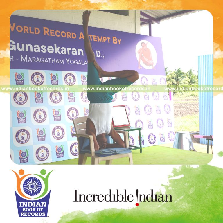 The Longest Duration Holding Daksina Ardha Sirsasana Yoga Pose on a Chair by an Individual (Male) lasted for 3 Minutes and 1 Seconds. It was accomplished by Dr.V.Gunasekaran, Founder-Maragatham Yogalayam at Udumalpet, Tirupur District, Tamil Nadu, India on September 24, 2019.