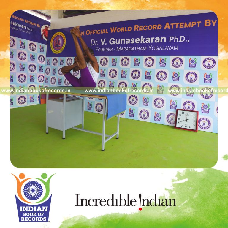 The Longest Duration Holding Daksina Ardha Urdhva Mukha Paschimottanasana Yoga Pose on a Table by an Individual (Male) lasted for 3 Minutes and 5 Seconds. It was accomplished by Dr.V.Gunasekaran, Founder-Maragatham Yogalayam at Udumalpet, Tirupur District, Tamil Nadu, India on September 22, 2019.