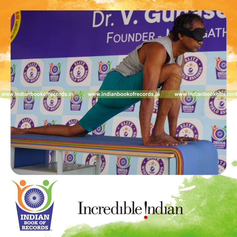 The Longest Duration Holding Daksina Asva Chanjalanasana Yoga Pose Blindfolded on a Table by an Individual (Male) lasted for 3 Minutes and 4 Seconds. It was accomplished by Dr.V.Gunasekaran, Founder-Maragatham Yogalayam at Udumalpet, Tirupur District, Tamil Nadu, India on September 29, 2019.