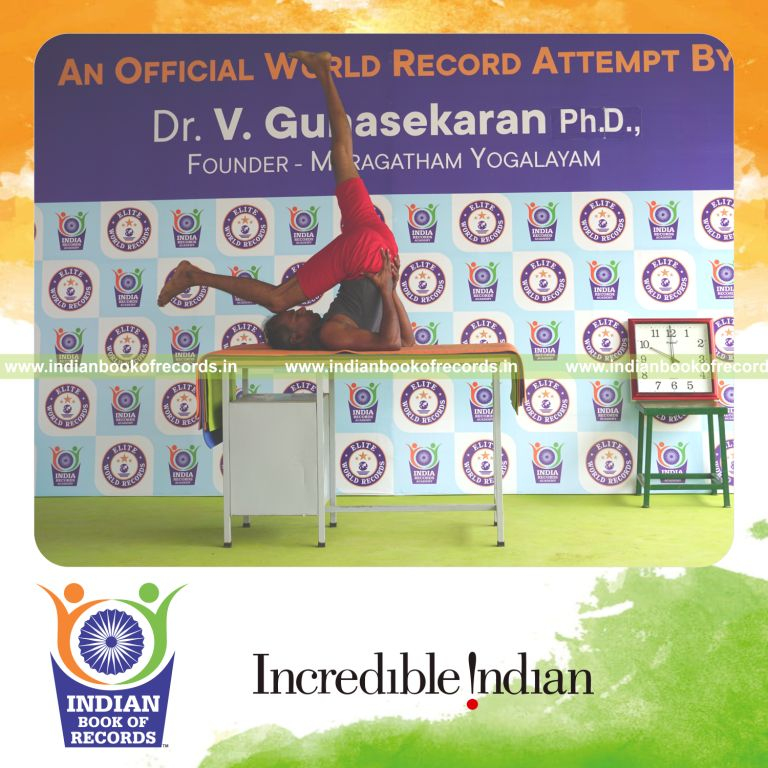 The Longest Duration Holding Daksina Ekapada Sarvangasana Yoga Pose on a Table by an Individual (Male) lasted for 4 Minutes and 3 Seconds. It was accomplished by Dr.V.Gunasekaran, Founder-Maragatham Yogalayam at Udumalpet, Tirupur District, Tamil Nadu, India on September 25, 2019.