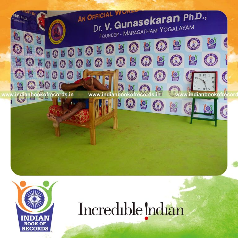 The Longest Duration Holding Daksina Ekapada Skandasana Yoga Pose on a Chair by an Individual (Male) lasted for 3 Minutes and 2 Seconds. It was accomplished by Dr.V.Gunasekaran, Founder-Maragatham Yogalayam at Udumalpet, Tirupur District, Tamil Nadu, India on September 28, 2019.