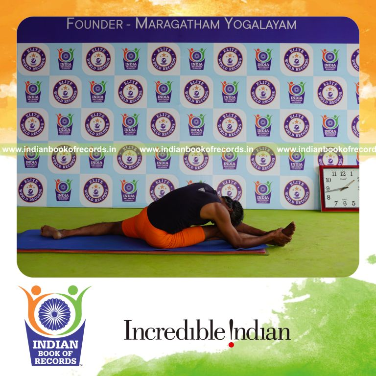 The Longest Duration Holding Daksina Hanumana Paschimottanasana Yoga Pose Blindfolded by an Individual (Male) lasted for 3 Minutes and 2 Seconds. It was accomplished by Dr.V.Gunasekaran, Founder-Maragatham Yogalayam at Udumalpet, Tirupur District, Tamil Nadu, India on September 26, 2019.