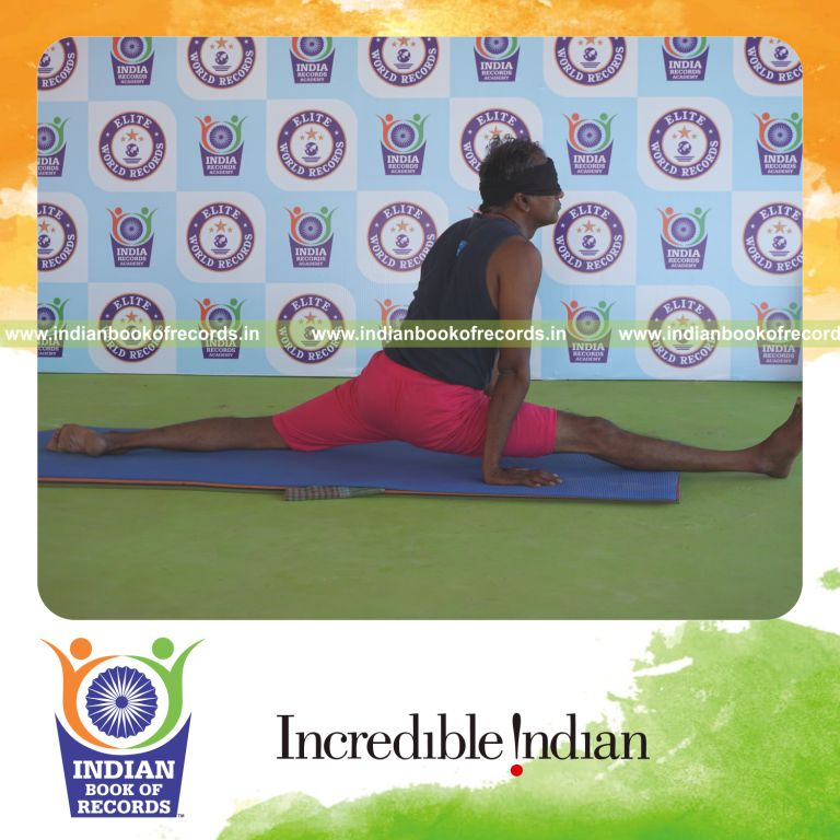 The Longest Duration Holding Daksina Hanumanasana Yoga Pose Blindfolded by an Individual (Male) lasted for 2 Minutes and 5 Seconds. It was accomplished by Dr.V.Gunasekaran, Founder-Maragatham Yogalayam at Udumalpet, Tirupur District, Tamil Nadu, India on September 21, 2019.