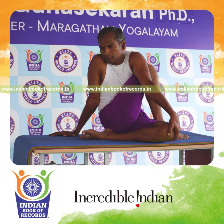The Longest Duration Holding Daksina Janu Ardha Matsyendrasana Yoga Pose on a Table by an Individual (Male) lasted for 3 Minutes and 5 Seconds. It was accomplished by Dr.V.Gunasekaran, Founder-Maragatham Yogalayam at Udumalpet, Tirupur District, Tamil Nadu, India on September 22, 2019.