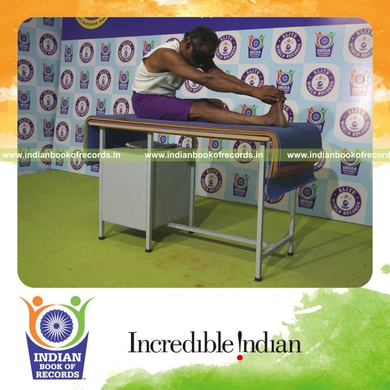 The Longest Duration Holding Daksina Mahamudra Yoga Pose Blindfolded on a Table by an Individual (Male) lasted for 3 Minutes and 1 Seconds. It was accomplished by Dr.V.Gunasekaran, Founder-Maragatham Yogalayam at Udumalpet, Tirupur District, Tamil Nadu, India on September 28, 2019.