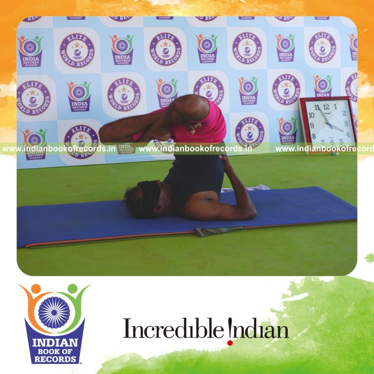 The Longest Duration Holding Daksina Parsva Padma Sarvangasana Yoga Pose Blindfolded by an Individual (Male) lasted for 4 Minutes and 5 Seconds. It was accomplished by Dr.V.Gunasekaran, Founder-Maragatham Yogalayam at Udumalpet, Tirupur District, Tamil Nadu, India on September 21, 2019.