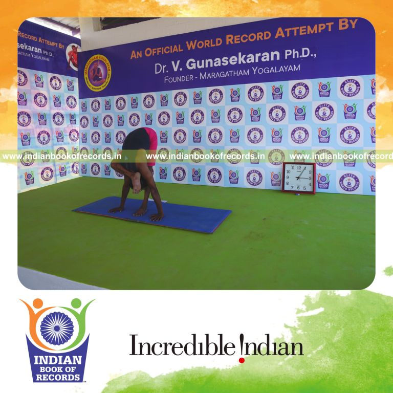 The Longest Duration Holding Daksina Ruchikasana Yoga Pose Blindfolded by an Individual (Male) lasted for 3 Minutes and 5 Seconds. It was accomplished by Dr.V.Gunasekaran, Founder-Maragatham Yogalayam at Udumalpet, Tirupur District, Tamil Nadu, India on September 21, 2019.
