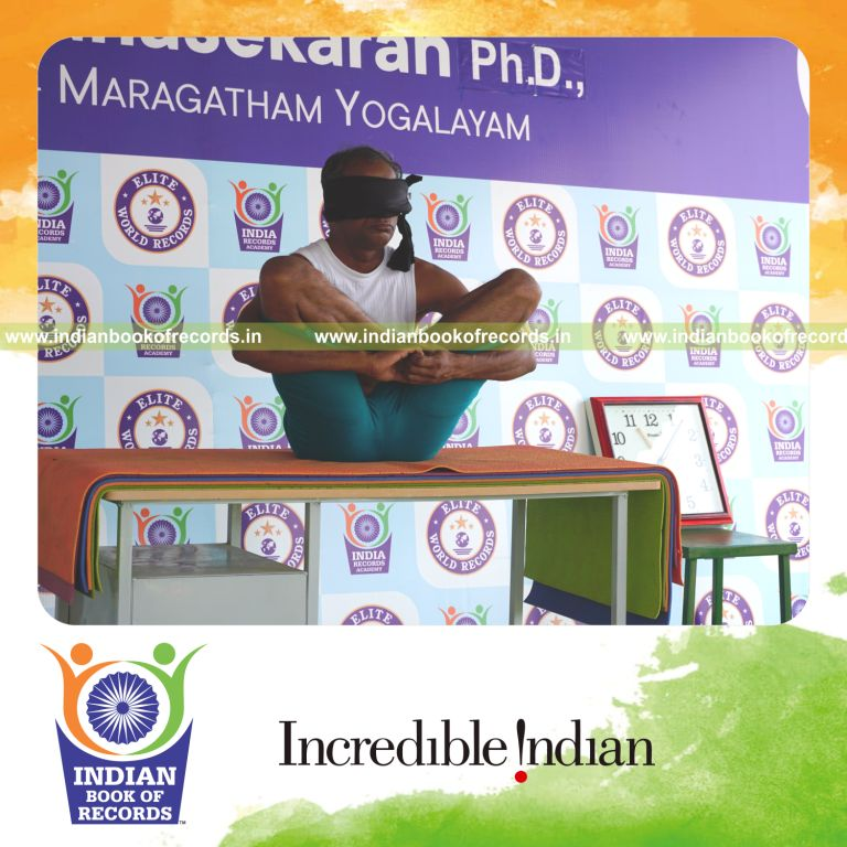 The Longest Duration Holding Garbha Pindasana Yoga Pose Blindfolded on a Table by an Individual (Male) lasted for 3 Minutes and 5 Seconds. It was accomplished by Dr.V.Gunasekaran, Founder-Maragatham Yogalayam at Udumalpet, Tirupur District, Tamil Nadu, India on September 24, 2019.