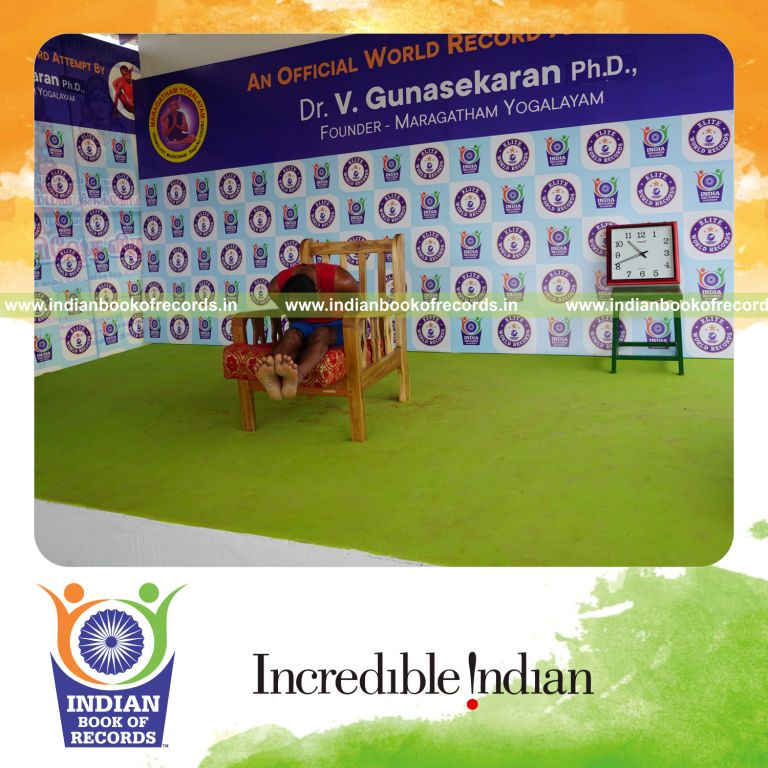 The Longest Duration Holding Gopura Paschimottanasana Yoga Pose on a Chair by an Individual (Male) lasted for 2 Minutes and 3 Seconds. It was accomplished by Dr.V.Gunasekaran, Founder-Maragatham Yogalayam at Udumalpet, Tirupur District, Tamil Nadu, India on September 28, 2019.