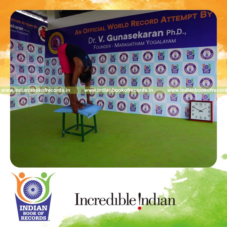 The Longest Duration Holding Padahasthasana Yoga Pose on a Stool by an Individual (Male) lasted for 2 Minutes and 2 Seconds. It was accomplished by Dr.V.Gunasekaran, Founder-Maragatham Yogalayam at Udumalpet, Tirupur District, Tamil Nadu, India on September 27, 2019.