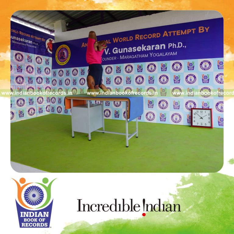 The Longest Duration Holding Padma Sirsasana Yoga Pose on a Table by an Individual (Male) lasted for 3 Minutes and 2 Seconds. It was accomplished by Dr.V.Gunasekaran, Founder-Maragatham Yogalayam at Udumalpet, Tirupur District, Tamil Nadu, India on September 27, 2019.