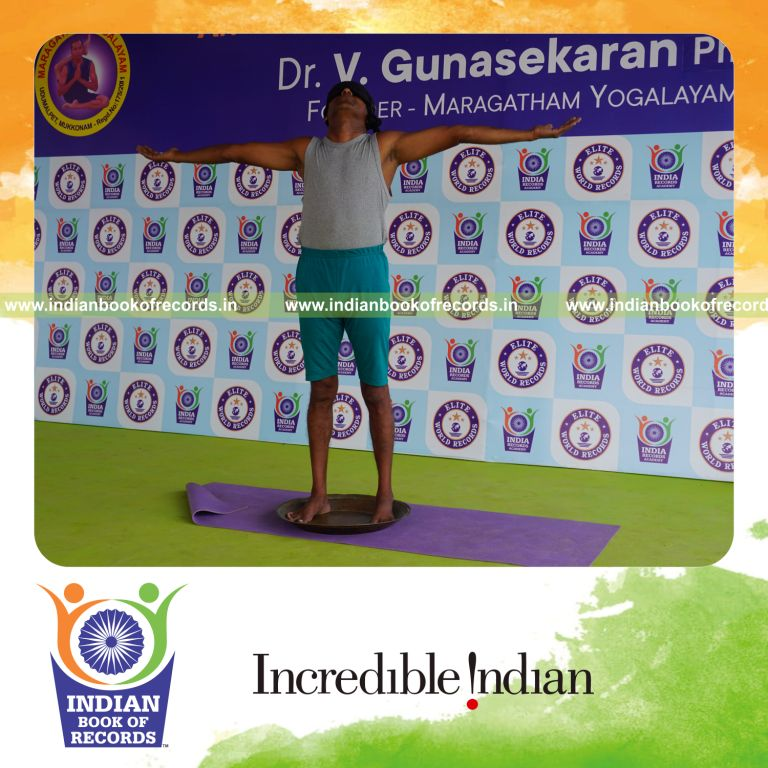 Longest Duration Holding Pirai Chaturmukha Trikonasana Yoga Pose Blindfolded on a Brass Plate by an Individual (Male)