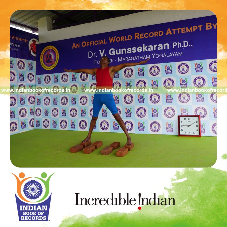 The Longest Duration Holding Pirai Chaturmukha Trikonasana Yoga Pose on Bricks by an Individual (Male) lasted for 2 Minutes and 1 Seconds. It was accomplished by Dr.V.Gunasekaran, Founder-Maragatham Yogalayam at Udumalpet, Tirupur District, Tamil Nadu, India on September 28, 2019.