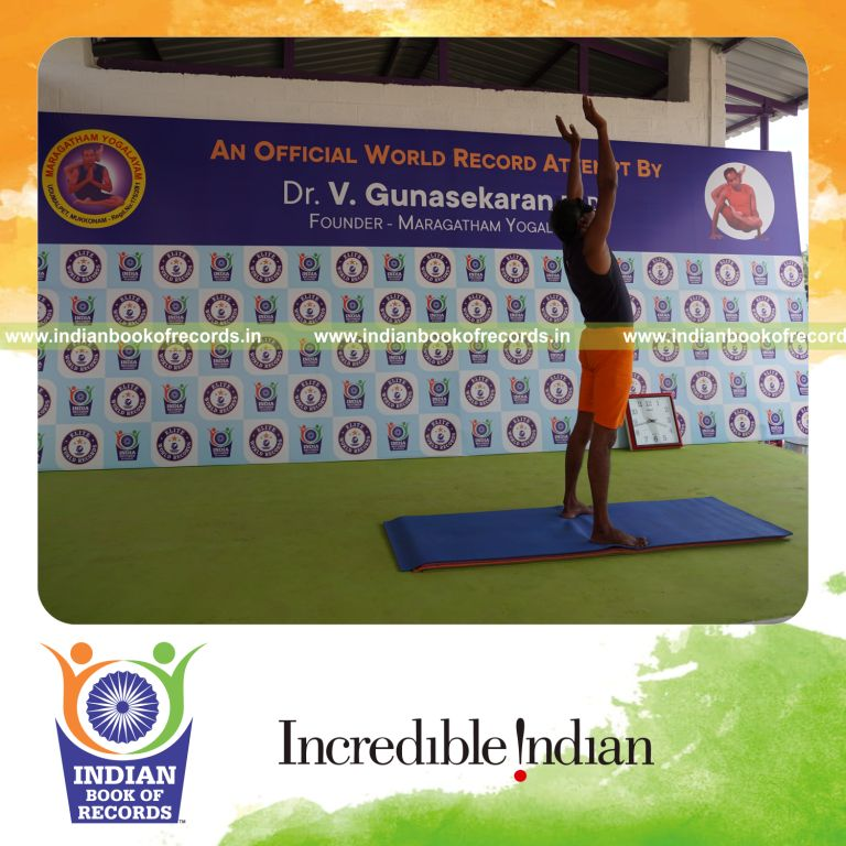 The Longest Duration Holding Piraiasana Yoga Pose Blindfolded by an Individual (Male) lasted for 3 Minutes and 2 Seconds. It was accomplished by Dr.V.Gunasekaran, Founder-Maragatham Yogalayam at Udumalpet, Tirupur District, Tamil Nadu, India on September 26, 2019.