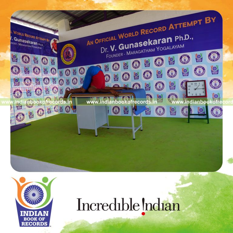 The Longest Duration Holding Sivalingasana Yoga Pose Blindfolded on a Table by an Individual (Male) lasted for 3 Minutes and 2 Seconds. It was accomplished by Dr.V.Gunasekaran, Founder-Maragatham Yogalayam at Udumalpet, Tirupur District, Tamil Nadu, India on September 28, 2019.