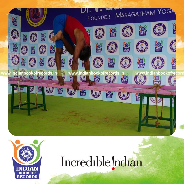 The Longest Duration Holding Vama Ardha Baddha Padmottasana Yoga Pose on a Ladder by an Individual (Male) lasted for 2 Minutes and 2 Seconds. It was accomplished by Dr.V.Gunasekaran, Founder-Maragatham Yogalayam at Udumalpet, Tirupur District, Tamil Nadu, India on September 28, 2019.