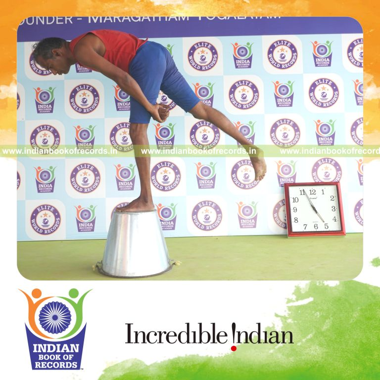 The Longest Duration Holding Vama Ardha Chandra Virabhadrasana Yoga Pose on a Bucket by an Individual (Male) lasted for 1 Minute and 35 Seconds. It was accomplished by Dr.V.Gunasekaran, Founder-Maragatham Yogalayam at Udumalpet, Tirupur District, Tamil Nadu, India on September 23, 2019.