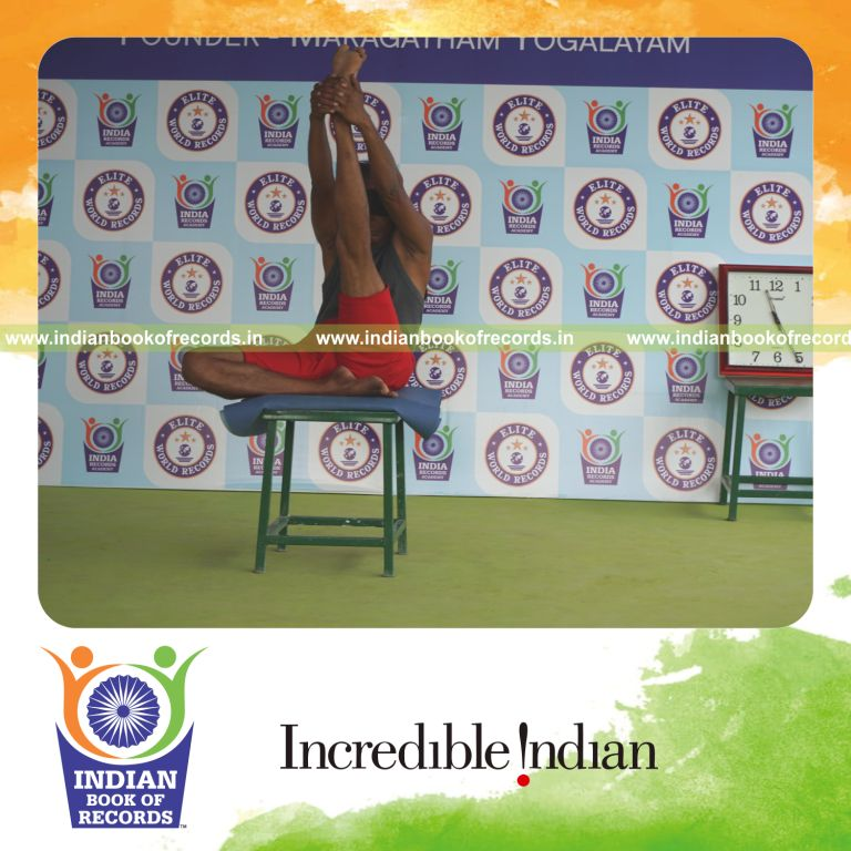 The Longest Duration Holding Vama Ardha Krounchasana Yoga Pose Blindfolded on a Stool by an Individual (Male) lasted for 2 Minutes and 4 Seconds. It was accomplished by Dr.V.Gunasekaran, Founder-Maragatham Yogalayam at Udumalpet, Tirupur District, Tamil Nadu, India on September 25, 2019.