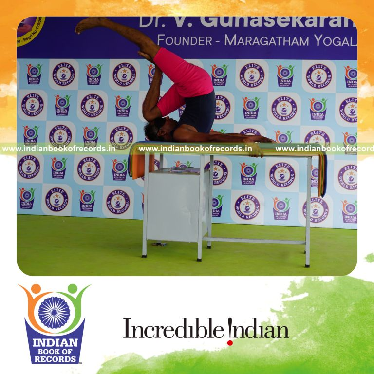 The Longest Duration Holding Vama Ardha Salamba Sarvangasana Yoga Pose Blindfolded on a Table by an Individual (Male) lasted for 3 Minutes and 2 Seconds. It was accomplished by Dr.V.Gunasekaran, Founder-Maragatham Yogalayam at Udumalpet, Tirupur District, Tamil Nadu, India on September 27, 2019.