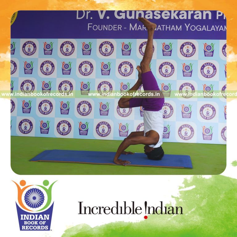 The Longest Duration Holding Vama Ardha Salamba Sirsasana (Second Type) Yoga Pose Blindfolded by an Individual (Male) lasted for 2 Minutes and 5 Seconds. It was accomplished by Dr.V.Gunasekaran, Founder-Maragatham Yogalayam at Udumalpet, Tirupur District, Tamil Nadu, India on September 22, 2019.