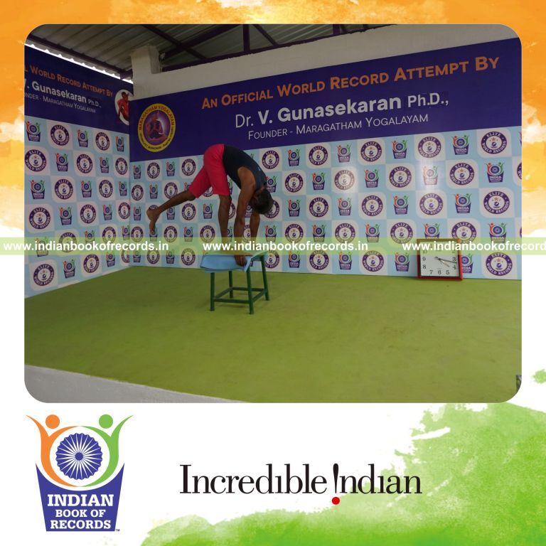 The Longest Duration Holding Vama Ekapada Padahastasana Yoga Pose on a Stool by an Individual (Male) lasted for 3 Minutes and 1 Second. It was accomplished by Dr.V.Gunasekaran, Founder-Maragatham Yogalayam at Udumalpet, Tirupur District, Tamil Nadu, India on September 27, 2019.