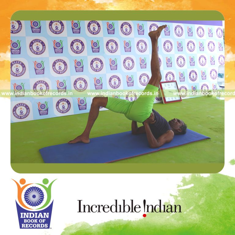 The Longest Duration Holding Vama Ekapada Setu Bandha Sarvangasana Yoga Pose by an Individual (Male) lasted for 3 Minutes. It was accomplished by Dr.V.Gunasekaran, Founder-Maragatham Yogalayam at Udumalpet, Tirupur District, Tamil Nadu, India on September 15, 2019.