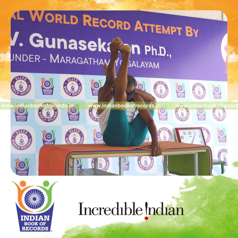 The Longest Duration Holding Vama Ekapada Sirasa Krounchasana Yoga Pose Blindfolded on a Table by an Individual (Male) lasted for 2 Minutes and 5 Seconds. It was accomplished by Dr.V.Gunasekaran, Founder-Maragatham Yogalayam at Udumalpet, Tirupur District, Tamil Nadu, India on September 24, 2019.