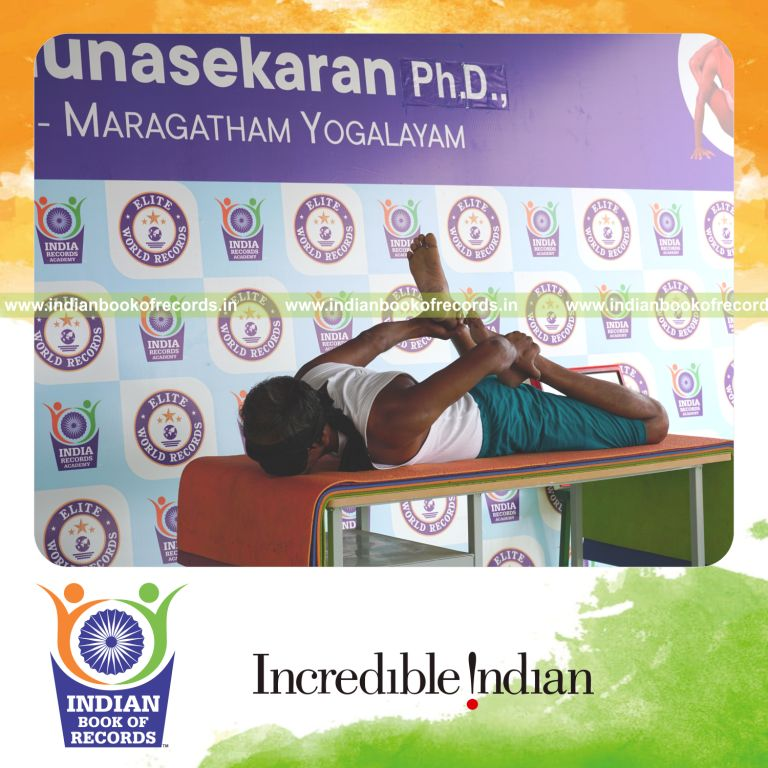 The Longest Duration Holding Vama Gherandasana (First Type) Yoga Pose Blindfolded on a Table by an Individual (Male) lasted for 2 Minutes and 5 Seconds. It was accomplished by Dr.V.Gunasekaran, Founder-Maragatham Yogalayam at Udumalpet, Tirupur District, Tamil Nadu, India on September 24, 2019.