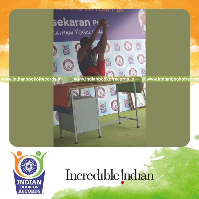 The Longest Duration Holding Vama Gomukha Krounchasana Yoga Pose Blindfolded on a Table by an Individual (Male) lasted for 3 Minutes and 5 Seconds. It was accomplished by Dr.V.Gunasekaran, Founder-Maragatham Yogalayam at Udumalpet, Tirupur District, Tamil Nadu, India on September 25, 2019.
