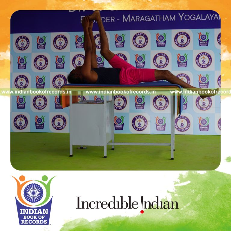 The Longest Duration Holding Vama Julasana Yoga Pose on a Table by an Individual (Male) lasted for 3 Minutes and 2 Seconds. It was accomplished by Dr.V.Gunasekaran, Founder-Maragatham Yogalayam at Udumalpet, Tirupur District, Tamil Nadu, India on September 27, 2019.